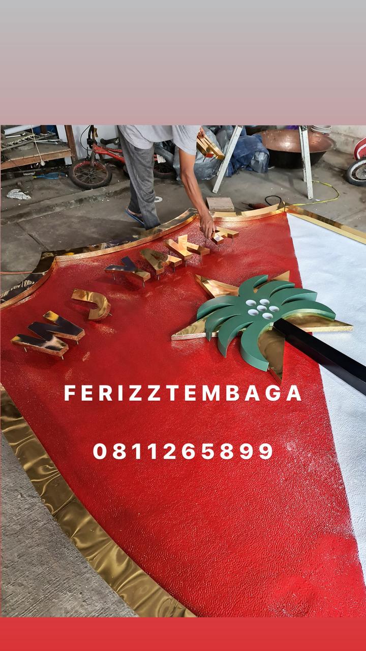 Tulisan dibuat dari plat kuningan tebal dengan finishing brushed gold yang elegan. Setiap huruf dirancang agar mudah terbaca dan memiliki kesan megah. Proses pemotongan dan pembentukan menggunakan teknik plasma cutting dan pengelasan presisi. Ferizz Tembaga memastikan kualitas terbaik untuk setiap hasil akhir.